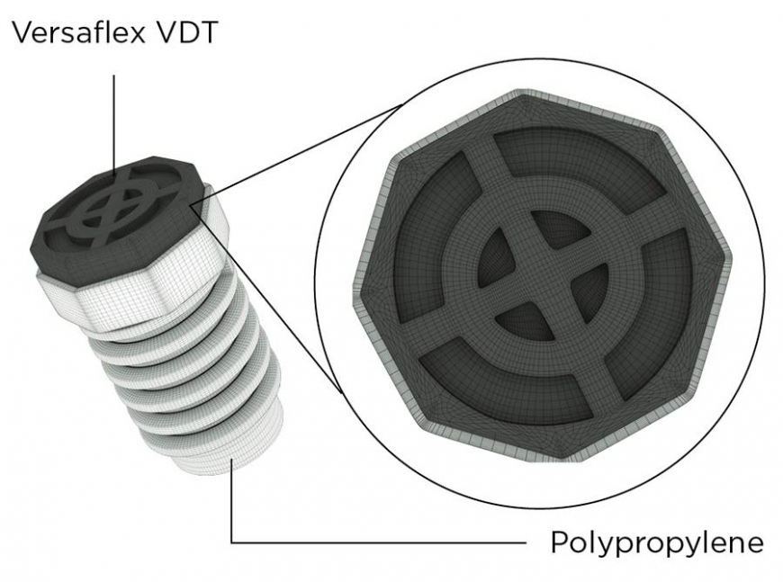 In addition, this material withstands wear and tear of daily use, is overmolded easily onto polypropylene, and reduces cycle time through the elimination of secondary operations, such as drying.