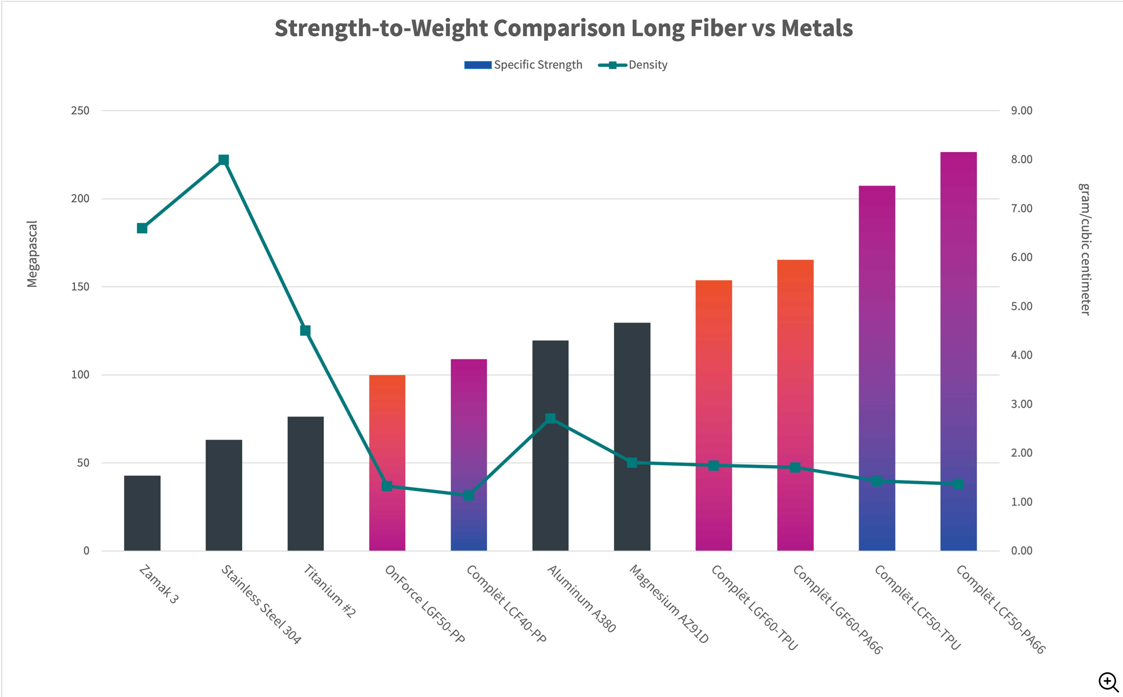With appropriate material selection and part design optimization, long carbon fiber materials can reduce the weight of components up to 40% compared to aluminum. Additional benefits include high strength and stiffness performance, creep resistance, fatigue endurance, elevated and low temperature performance, dimensional stability, and corrosion and chemical resistance.